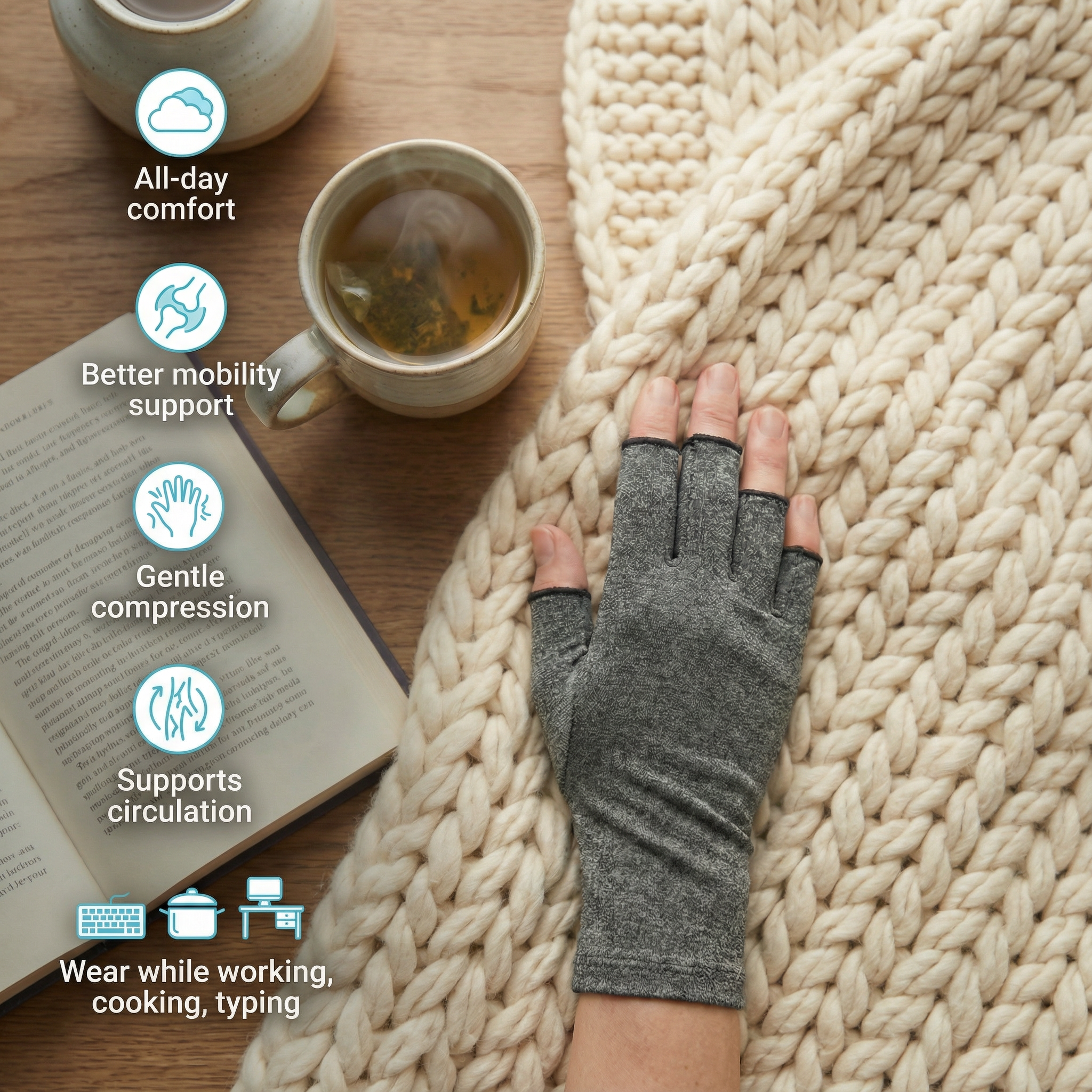 The fingerless design keeps your hands functional, so you can still do everyday tasks like typing, texting, cooking, or crafting—with less pain.